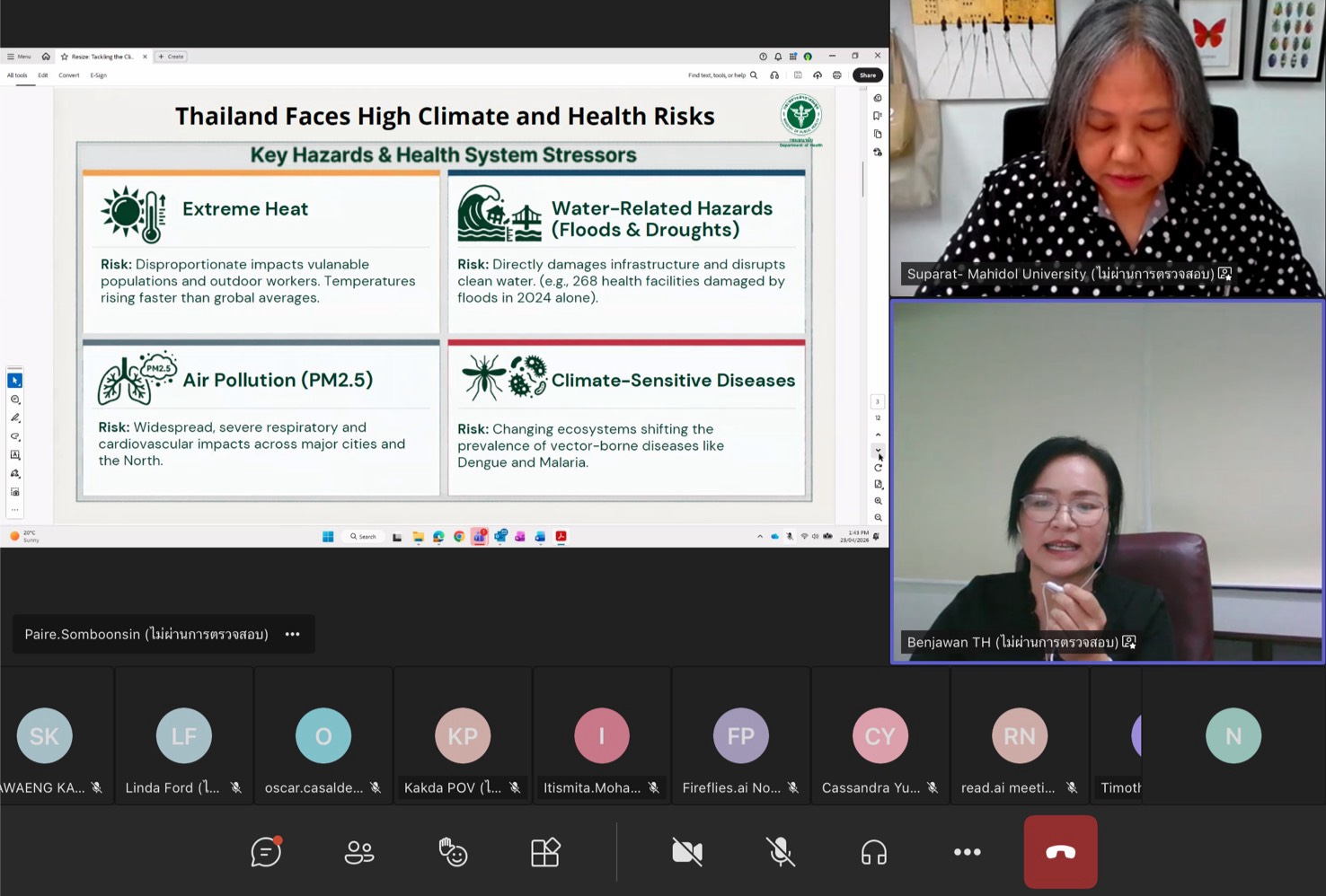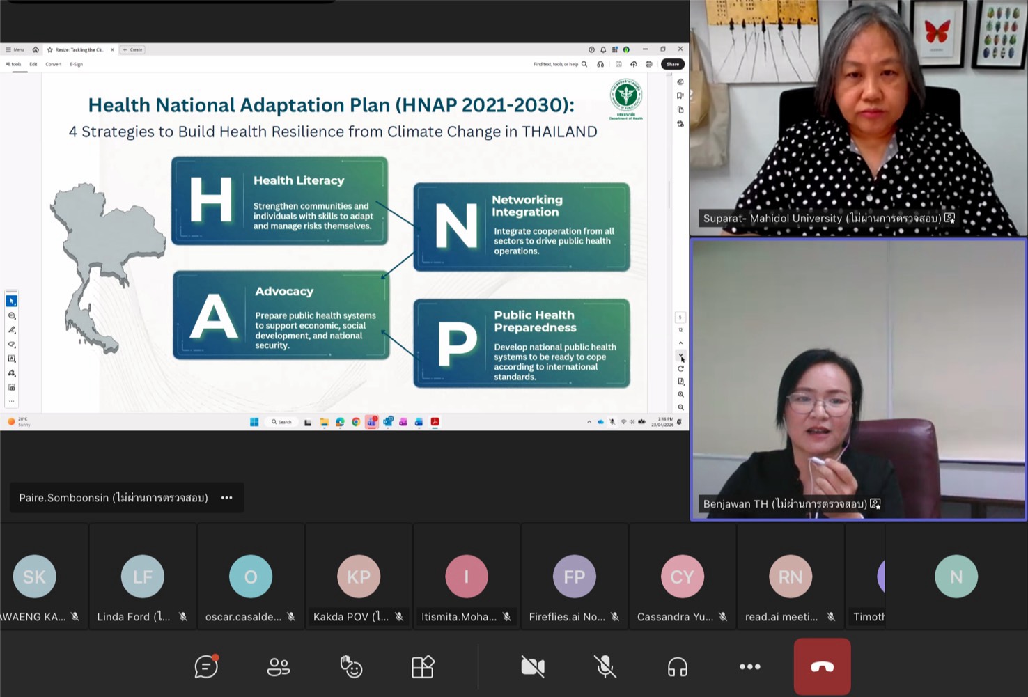 สำหรับประเทศไทย ผู้แทนกรมอนามัยได้นำเสนอในหัวข้อ "Climate Change, wildfire smoke and health impact in THAILAND” โดยแสดงสถานการณ์ความเสี่ยงที่สำคัญในประเทศไทย ได้แก่ คลื่นความร้อน มลพิษทางอากาศ (PM2.5) ภัยพิบัติน้ำท่วม ภัยแล้ง และโรคที่ไวต่อสภาพภูมิอากาศ การดำเนินการภายใต้แผน HNAP 2021 – 2030 ควบคู่กับมาตรการด้านการแพทย์และสาธารณสุขกรณี PM2.5 พร้อมด้วยตัวอย่างการดำเนินงานที่สำคัญ ได้แก่ การใช้ข้อมูลเชิงประจักษ์ในการเฝ้าระวังและแจ้งเตือน (Data-driven surveillance) การสร้างพื้นที่ปลอดภัยสำหรับกลุ่มเปราะบาง เช่น ห้องปลอดฝุ่นและห้องคลายร้อน รวมถึงการส่งเสริมการปรับตัวในระดับชุมชน