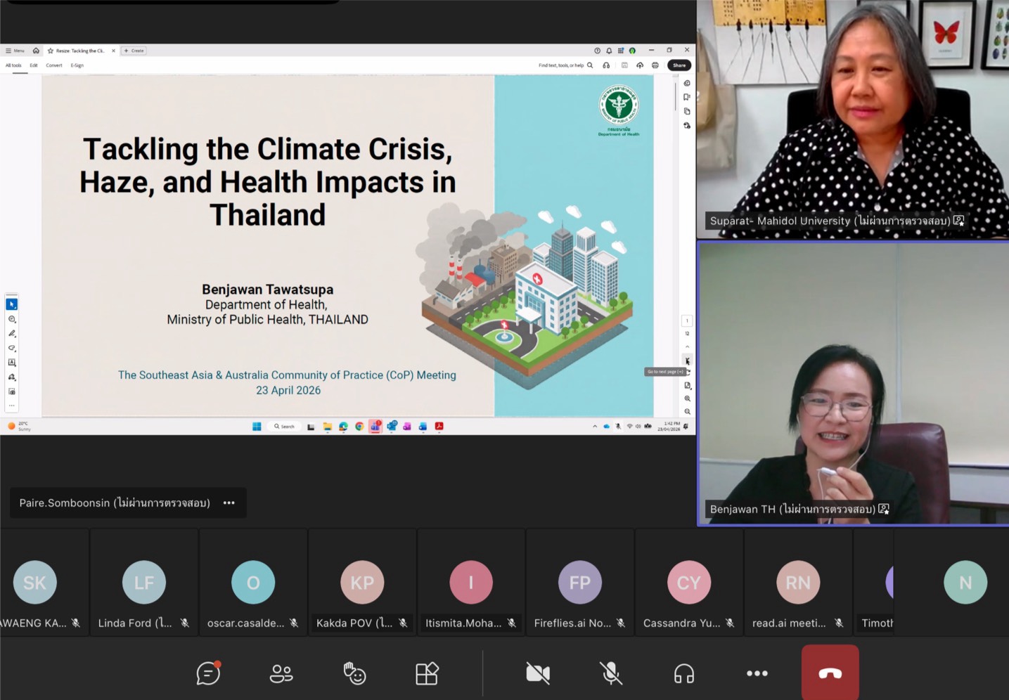 วันที่ 23 เมษายน 2569 ดร.จิตติมา รอดสาสดิ์ ผู้อำนวยการกองประเมินผลกระทบต่อสุขภาพ มอบหมาย ดร.เบญจวรรณ ธวัชสุภา รองผู้อำนวยการกองประเมินผลกระทบต่อสุขภาพ ร่วมเป็นวิทยากรในการประชุม Southeast Asia and Australia Community of Practice (CoP) ภายใต้โครงการ CANBREATHE and HEAL?HAZE project ซึ่งเป็นโครงการความร่วมมือวิจัยระหว่างประเทศ นำโดย NHMRC Healthy Environments And Lives (HEAL) Global Research Centre, University of Canberra ร่วมกับภาคีเครือข่ายในประเทศไทย อินโดนีเซีย กัมพูชา สปป.ลาว และออสเตรเลีย สนับสนุนทุนโดย Wellcome Trust และ e-Asia JRP เพื่อศึกษาผลกระทบต่อสุขภาพจากการเปลี่ยนแปลงสภาพภูมิอากาศ หมอกควัน ไฟป่า และคุณภาพอากาศ