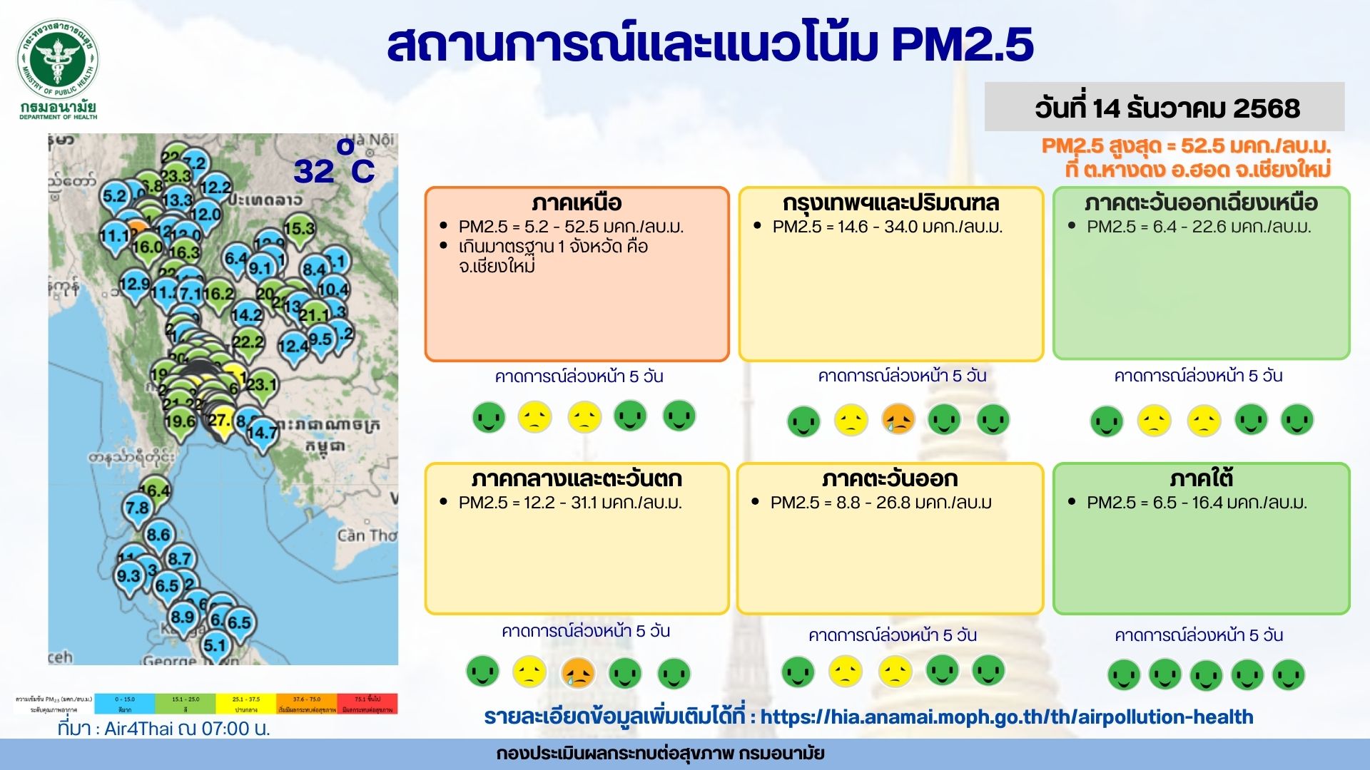 สถานการณ์และแนวโน้ม PM2.5 วันที่ 14 ธันวาคม 2568
