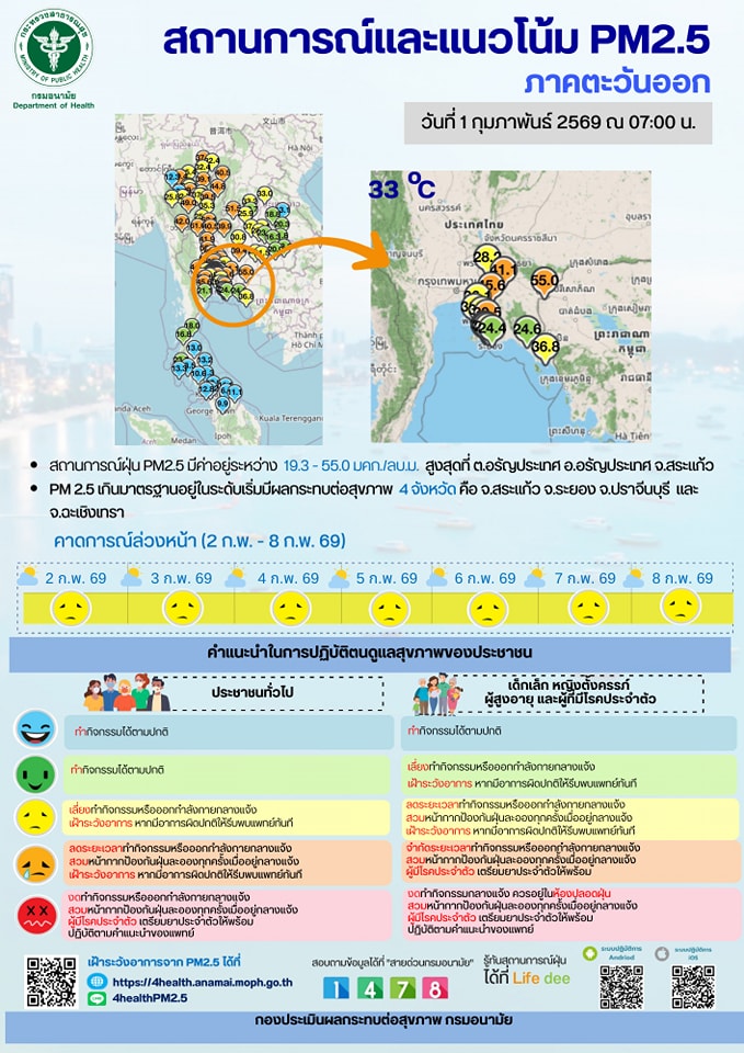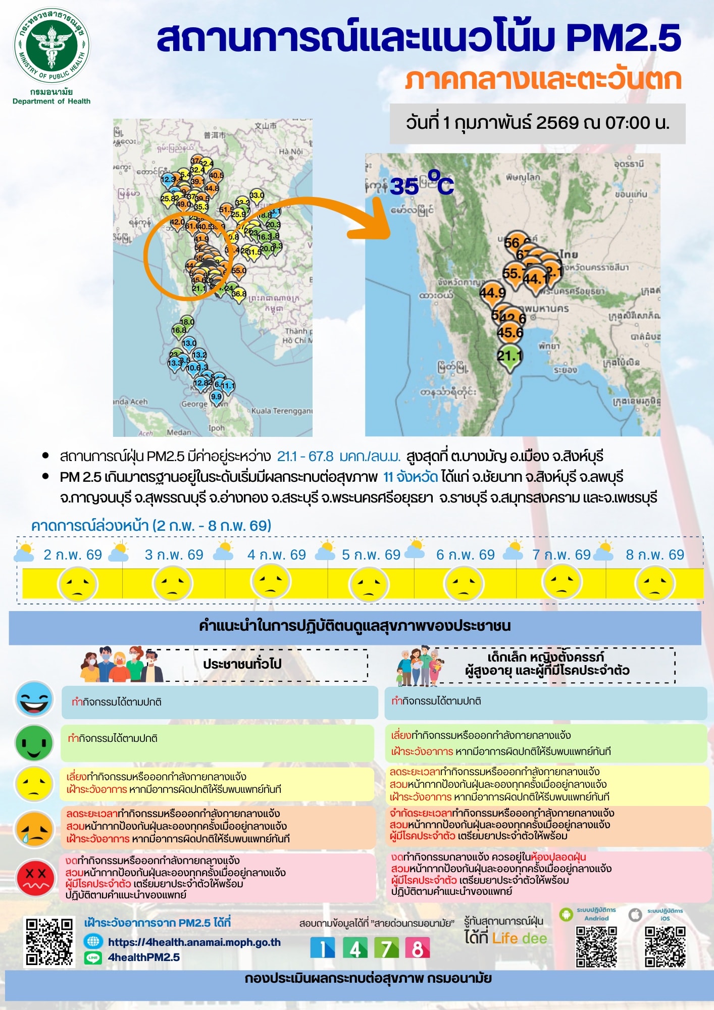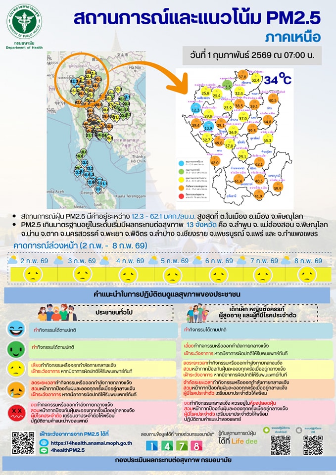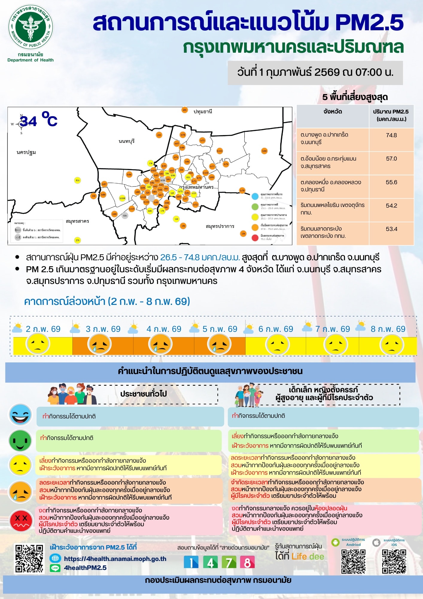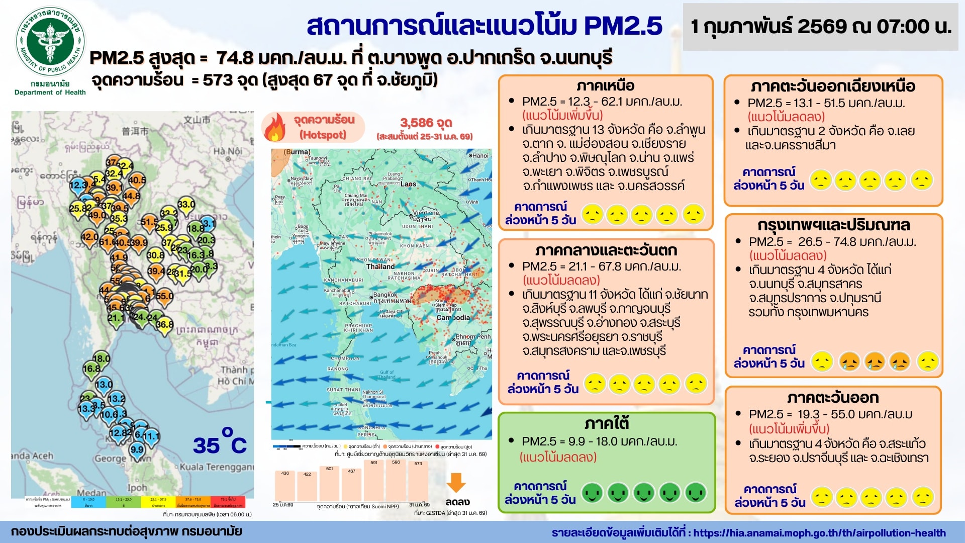 สถานการณ์และแนวโน้ม PM2.5 วันที่ 1 กุมภาพันธ์ 2569