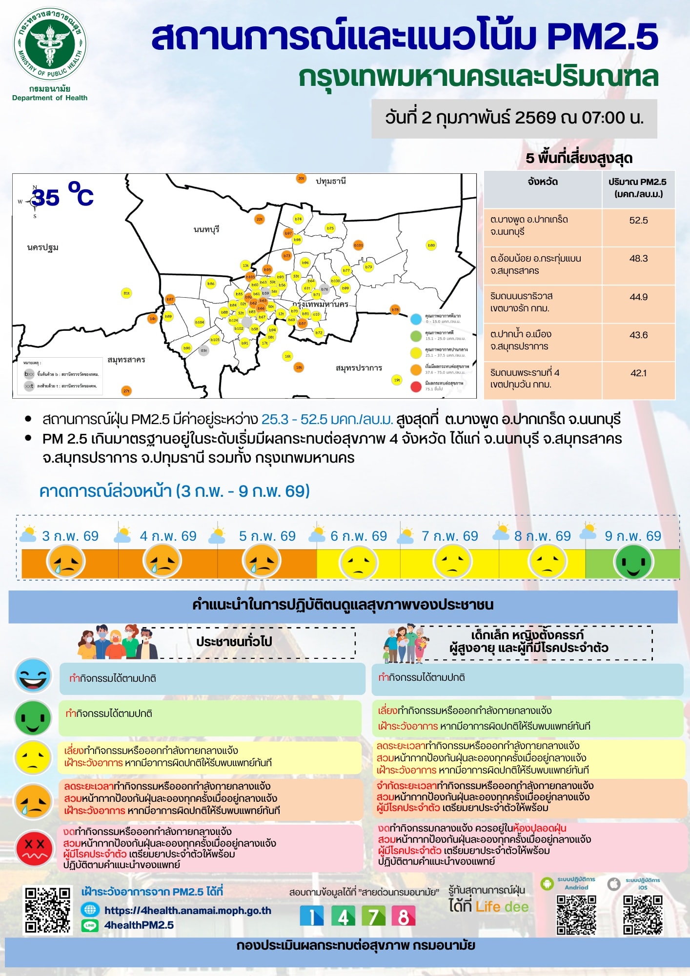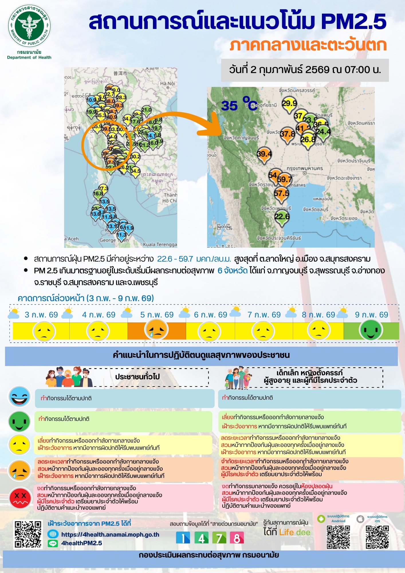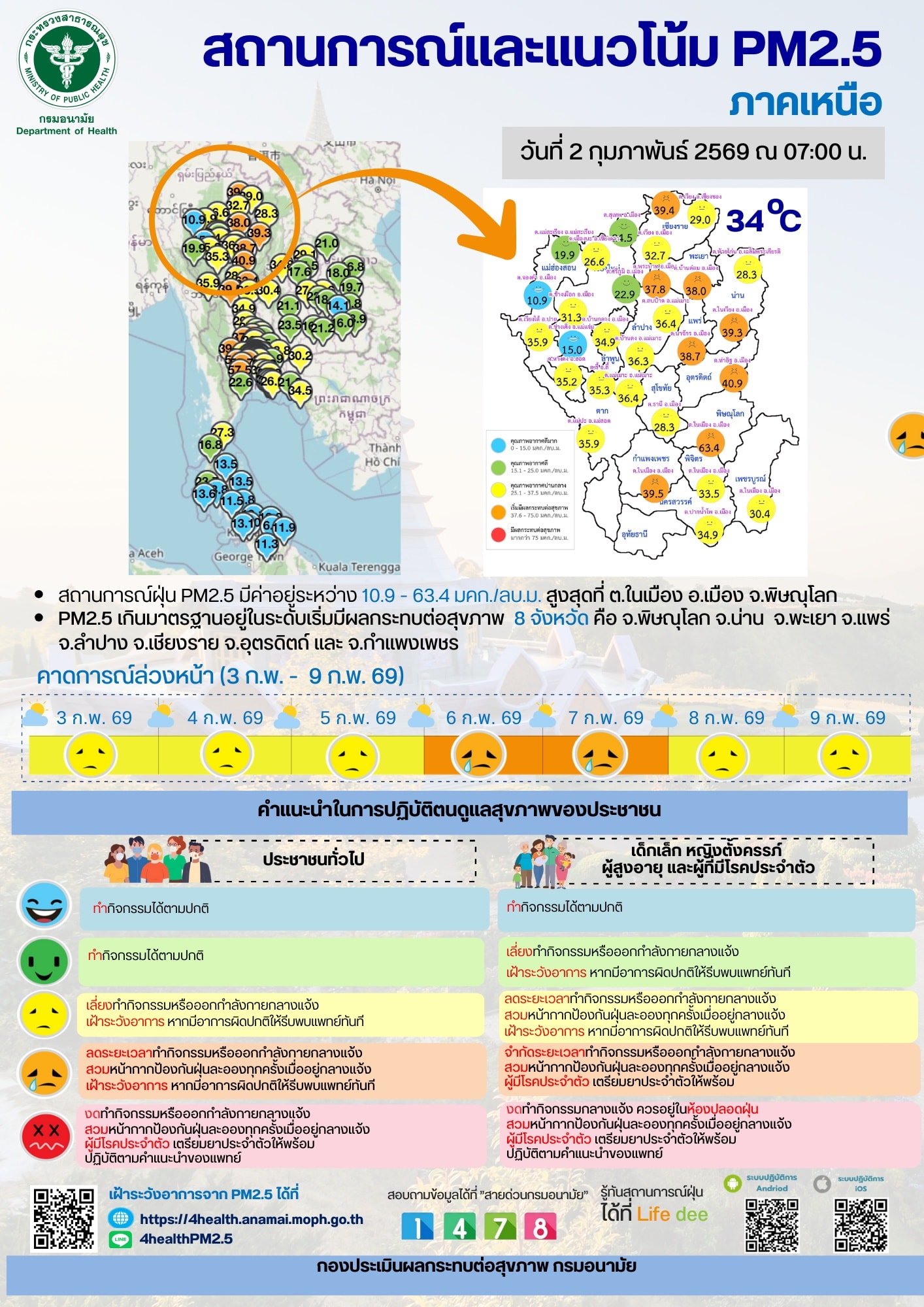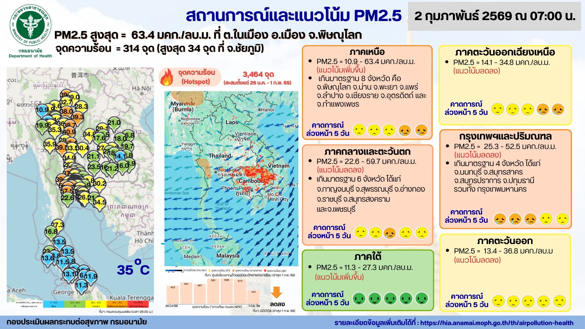 สถานการณ์และแนวโน้ม PM2.5 วันที่ 2 กุมภาพันธ์ 2569