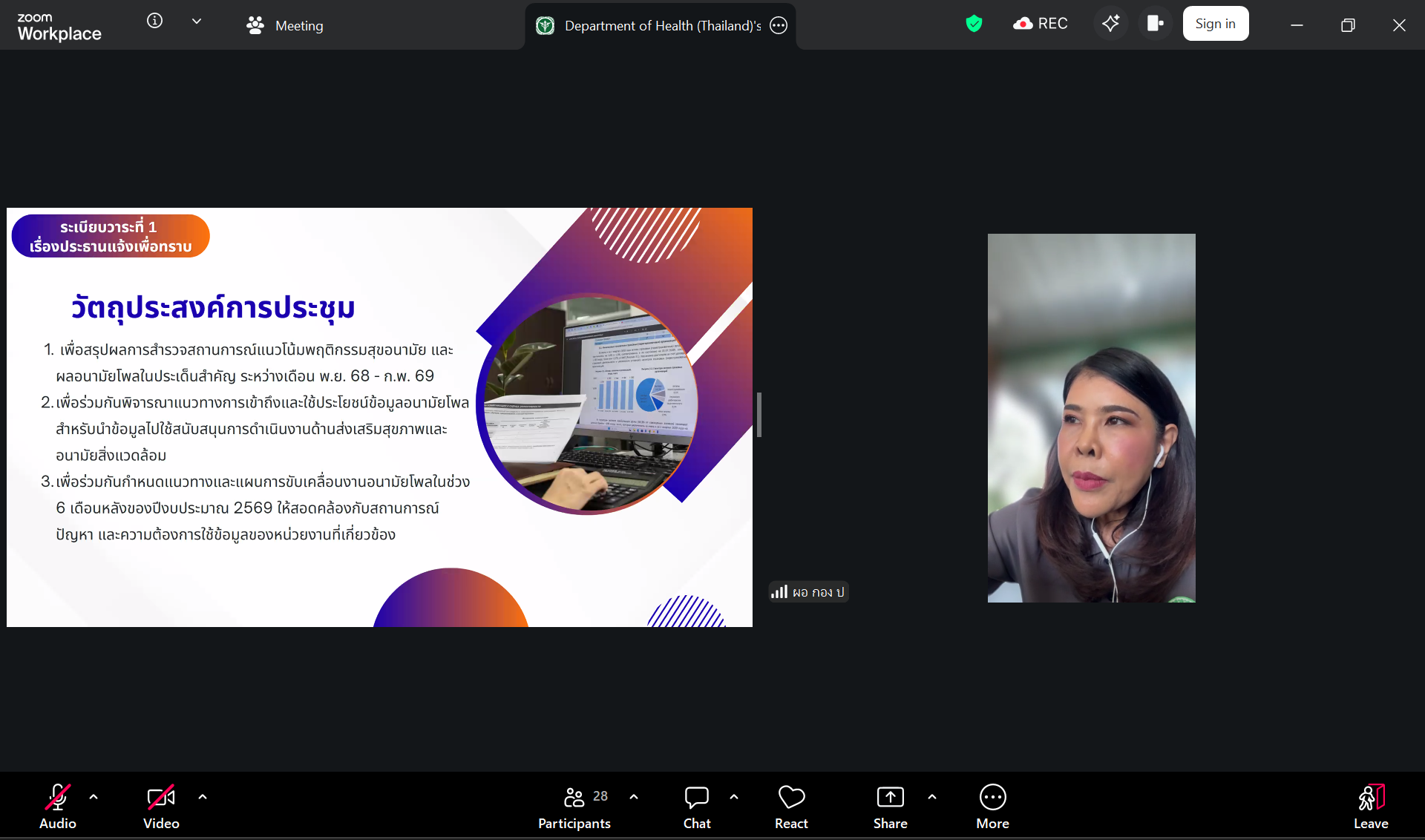 วันที่ 20 มีนาคม 2569 กองประเมินผลกระทบต่อสุขภาพ ได้จัดประชุมปรึกษาหารือคณะทำงานขับเคลื่อนอนามัยโพล กรมอนามัย ครั้งที่ 2/2569 ณ ห้องประชุม 1 กองประเมินผลกระทบต่อสุขภาพ และผ่านระบบ Video conference โดยมี ดร.จิตติมา รอดสวาสดิ์ ผู้อำนวยการกองประเมินผลกระทบต่อสุขภาพ เป็นประธานการประชุม และมีผู้เข้าร่วมประชุมรวม 48 คน ประกอบด้วย คณะทำงานขับเคลื่อนอนามัยโพล เจ้าหน้าที่กรมอนามัยที่เกี่ยวข้องจากหน่วยงานส่วนกลาง ศูนย์อนามัยที่ 1-12 และกองประเมินผลกระทบต่อสุขภาพ โดยการประชุมครั้งนี้มีวัตถุประสงค์ ดังนี้ 1) เพื่อสรุปผลการสำรวจสถานการณ์แนวโน้มพฤติกรรมสุขอนามัยและผลอนามัยโพลในประเด็นสำคัญ ระหว่างเดือนพฤศจิกายน 2568 – กุมภาพันธ์ 2569 2) เพื่อร่วมกันพิจารณาแนวทางการเข้าถึงและใช้ประโยชน์ข้อมูลอนามัยโพล สำหรับนำข้อมูลไปใช้สนับสนุนการดำเนินงานด้านส่งเสริมสุขภาพและอนามัยสิ่งแวดล้อม และ 3) เพื่อร่วมกันกำหนดแนวทางและแผนการขับเคลื่อนงานอนามัยโพลในช่วง 6 เดือนหลังของปีงบประมาณ 2569 ให้สอดคล้องกับสถานการณ์ ปัญหาและความต้องการใช้ข้อมูลของหน่วยงานที่เกี่ยวข้อง